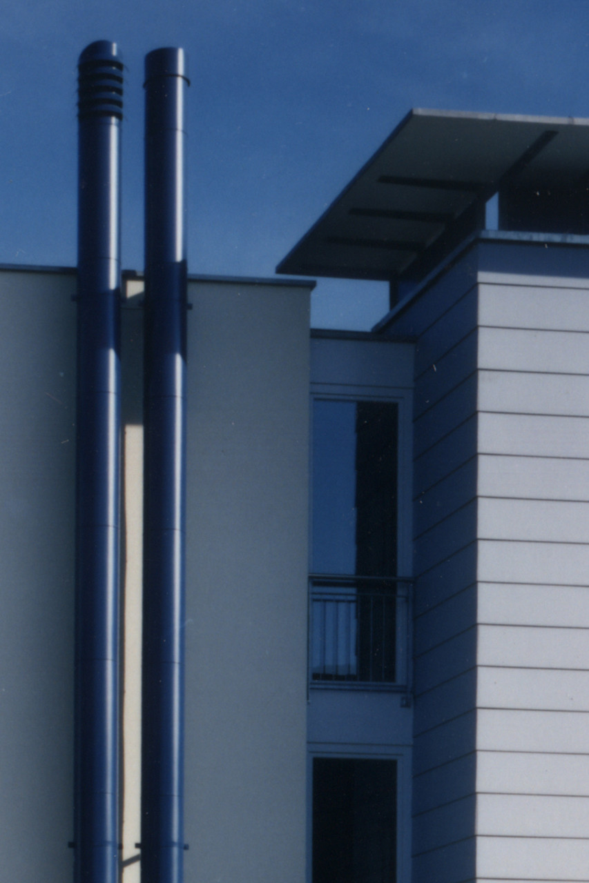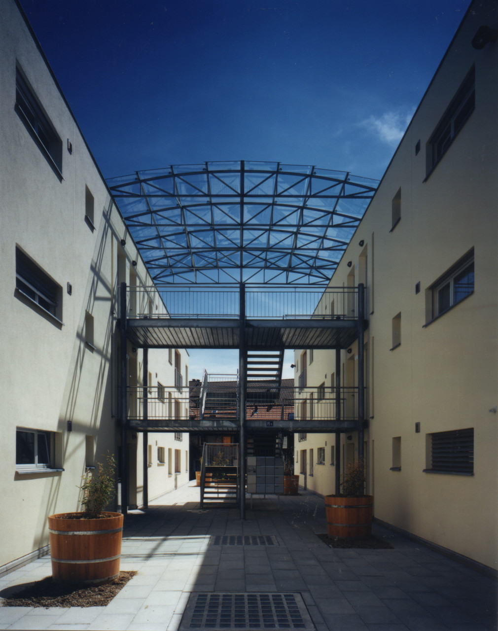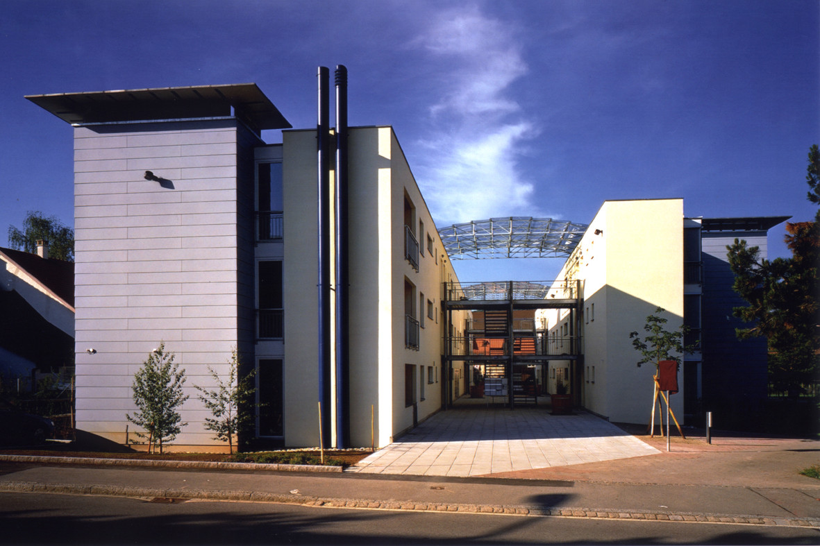 bildet das Gebäudepaar eine urbane Gasse als Zugangs- und Kommunikationszone aus. Der dritte Baukörper schliesst die Lücke an der Strasse und vermittelt gestalterisch zwischen den Neu- bauten und